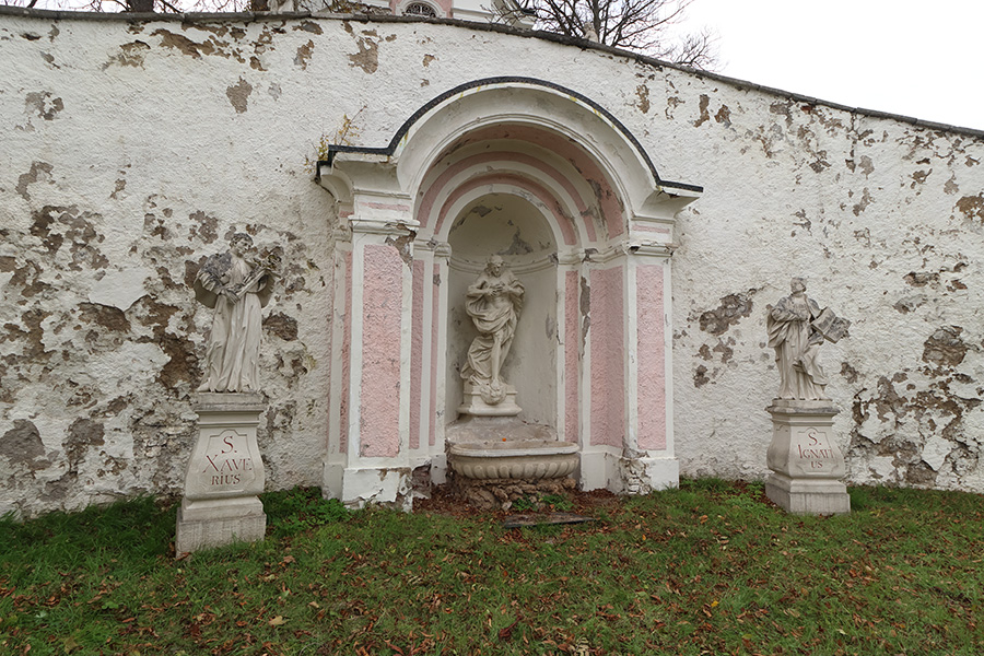 Der Kreuzweg selbst entstand zwischen 1731 und 1748 auf Initiative von Abt Robert Leeb, der ihn nach dem Vorbild des Kreuzwegs in Jerusalem anlegen ließ, den er selbst begangen hatte. In 13 Stationen führt er durch eine barocke Landschaft der Andacht, gestaltet von bedeutenden Künstlern der Zeit, darunter Giovanni Giuliani. Die Christusdarstellung am Ende fasst diesen Weg sinnbildlich zusammen: als ruhiger, eindringlicher Abschluss eines Pilger- und Meditationswegs, der Leiden, Glauben und Erlösung miteinander verbindet.