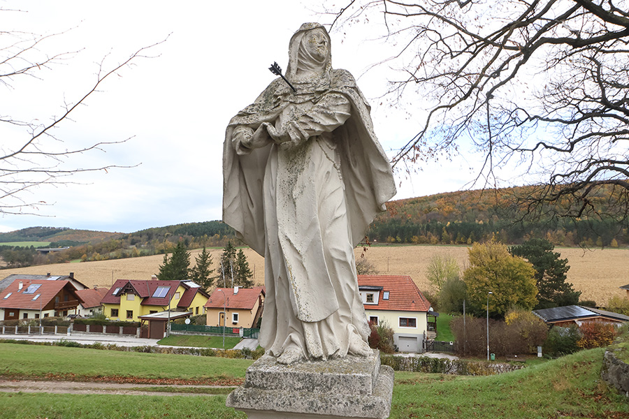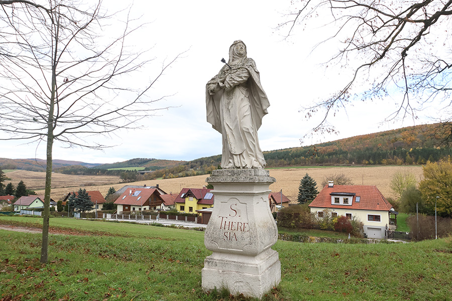 Statue der Heiligen Theresia am barocken Kreuzweg in Stift Heiligenkreuz. Die Figur aus der 1. Hälfte des 18. Jahrhunderts stammt von Josef Schnitzer.