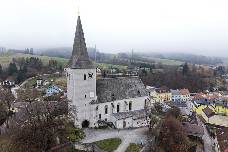 Charakteristisch sind die schlanken Strebepfeiler, das spätgotische Portal, Sitznischen und ein feingearbeitetes Sakramentshäuschen im Innenraum. Neben der Hauptkirche findet sich eine kleine, später hinzugefügte Lourdeskapelle, die sich harmonisch an die Nordseite schmiegt. Durch ihre erhöhte Lage, die Verbindung von Wehr- und Sakralarchitektur sowie die geschlossene gotische Gestaltung zählt die Pfarrkirche zu den architektonisch eindrucksvolleren Dorfkirchen des niederösterreichischen Alpenvorlands.