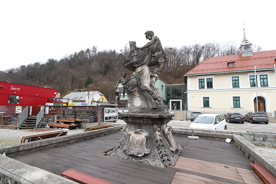 Ursprünglich stand die Nepomuk-Gruppe am Brückenkopf einer Holzbrücke über die Traisen, die das Stift mit dem Ort verband. Obwohl diese Brücke heute nicht mehr existiert, blieb der Standort beim heutigen Gebäude in der Dörflstraße 4 erhalten. Das Denkmal zählt zu den frühen Darstellungen des Heiligen, da seine Heiligsprechung erst 1729 erfolgte.