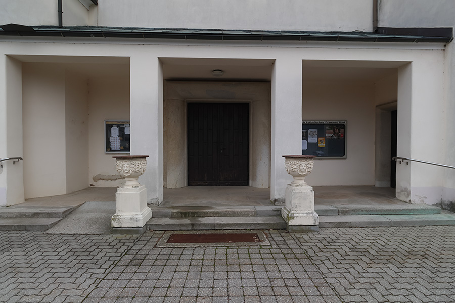 Blumenschale vor der Pfarrkirche zum heiligen Martin in Rust im Tullnerfeld. Die Schale steht auf einem quadratischen Sockel mit kurzem Fuß und wirkt dadurch ruhig und monumental. Rund um die Schale sind mehrere weibliche Köpfe im antiken Stil als Relief ausgearbeitet, verbunden durch ein umlaufendes Kettenmotiv am oberen Rand. Die fein modellierten Gesichter und das wellige Haar erinnern an antike Vorbilder und geben der Schale einen würdevollen, beinahe sakralen Charakter.