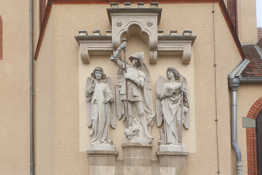 Die steinerne Figurengruppe zeigt die drei Erzengel Michael, Gabriel und Rafael in charakteristischen Darstellungen. In der Mitte steht Michael als himmlischer Kämpfer in Rüstung, der mit der Lanze den Drachen – Sinnbild des Bösen – bezwingt. Links ist Gabriel mit einer Lilie dargestellt, dem traditionellen Zeichen der Verkündigung und Reinheit. Rechts hält Rafael den Wanderstab und einen Fisch, Symbole seiner heilenden und begleitenden Rolle. Gemeinsam verkörpern die drei Erzengel Schutz, göttliche Botschaft und Heilung – Tugenden, die dem Denkmal eine tröstende und hoffnungsvolle Bedeutung verleihen.
