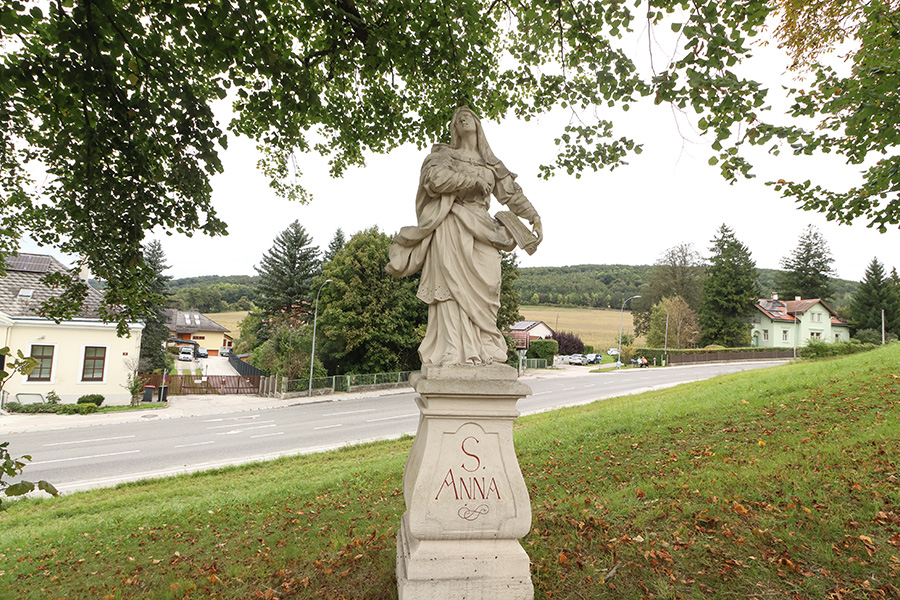 Statue der Heiligen Anna in Heiligenkreuz. Die Heilige Anna erscheint dort als Teil der 37 Sandsteinfiguren, die den barocken Kreuzweg bzw. Kalvarienberg in Heiligenkreuz schmücken. Diese Kreuzweganlage wurde ab 1731 unter der künstlerischen Leitung von Giovanni Giuliani begonnen und später von Lukas Troger und Josef Schnitzer weitergeführt.