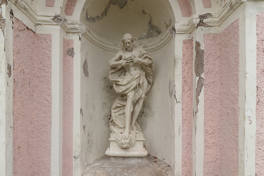 Am Ende des barocken Kreuzwegs von Heiligenkreuz steht eine Christusfigur, die den Abschluss und geistigen Höhepunkt des Weges bildet. In einer rundbogigen, rosé-weiß gefassten Nische dargestellt, erscheint Christus leidend, gesammelt und in sich gekehrt. Der leicht nach vorne geneigte Körper, das sparsam drapierte Tuch und der ernste Gesichtsausdruck verweisen nicht auf dramatische Aktion, sondern auf stilles Ertragen und innere Hingabe. Die Figur lädt zur persönlichen Betrachtung ein und wirkt wie ein Moment des Innehaltens nach dem langen Weg der Passion.