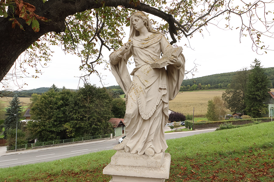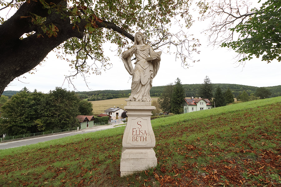 Statue der Heiligen Elisabeth in Heiligenkreuz. Die Heilige Elisabeth erscheint dort als Teil der 37 Sandsteinfiguren, die den barocken Kreuzweg bzw. Kalvarienberg in Heiligenkreuz schmücken. Diese Kreuzweganlage wurde ab 1731 unter der künstlerischen Leitung von Giovanni Giuliani begonnen und später von Lukas Troger und Josef Schnitzer weitergeführt.