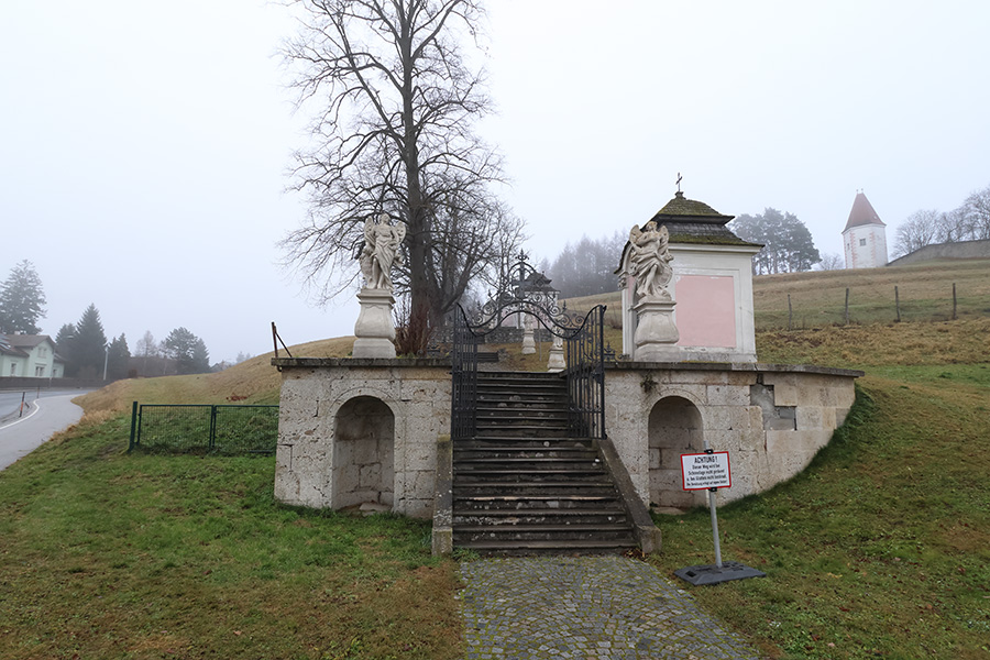 Statue eines Engels am Beginn des barocken Kreuzweges in Heiligenkreuz. Die Sandsteinfiguren von Giovanni Giuliani wurden ab 1731 angefertigt. In der Wappenkartusche der Spruch "Nehme dein Kreuz auf dich".