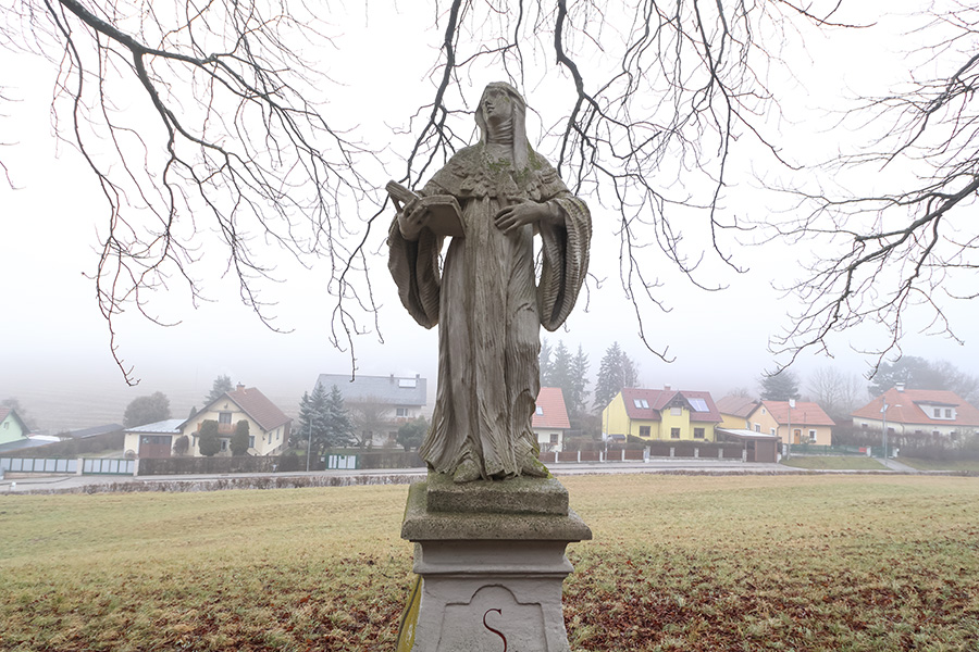 Statue der Hl. Scholastika am barocken Kreuzweg in Heiligenkreuz. Die dort befindlichen Sandsteinfiguren wurden ab 1731 angefertigt.