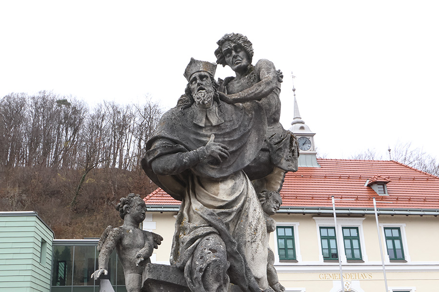 Ursprünglich stand die Nepomuk-Gruppe am Brückenkopf einer Holzbrücke über die Traisen, die das Stift mit dem Ort verband. Obwohl diese Brücke heute nicht mehr existiert, blieb der Standort beim heutigen Gebäude in der Dörflstraße 4 erhalten. Das Denkmal zählt zu den frühen Darstellungen des Heiligen, da seine Heiligsprechung erst 1729 erfolgte.