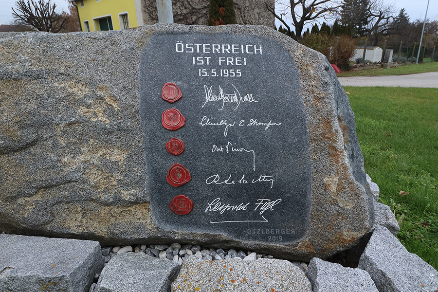 In Rust im Tullnerfeld befindet sich ein Gedenkstein, der an den Österreichischen Staatsvertrag von 1955 erinnert. Das Denkmal besteht aus einem großen, naturbelassenen Findling, der auf einem niedrigen Sockel aus grob behauenen Steinquadern ruht und durch seine schlichte, massive Form Beständigkeit und historische Schwere ausdrückt. In die Vorderseite des Steins ist eine dunkle Steinplatte eingelassen, die die Inschrift „Österreich ist frei – 15.5.1955“ trägt. Darunter sind die eingravierten Unterschriften der Außenminister der vier alliierten Besatzungsmächte sowie von Leopold Figl zu sehen, ergänzt durch mehrere rote Wachssiegel, die symbolisch auf die Originalurkunden des Staatsvertrags verweisen. Am unteren Rand der Platte finden sich die Signatur des Künstlers und die Jahreszahl 2019.