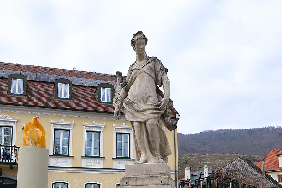 Im historischen Zentrum von Spitz an der Donau stand einst ein Brunnen, der von drei Figuren geprägt war, den sogenannten „Supperer-Weibern“. Diese traditionellen Brunnenfiguren wurden 1959 zerstört, als im Zuge einer Veranstaltung der Winzergenossenschaft eine überdimensionale Weinflasche über den Brunnen gestülpt wurde und dabei die Skulpturen zu Bruch gingen. Da eine Wiederherstellung der Originalfiguren nicht möglich war, erhielt der Brunnen später eine neue zentrale Figur: eine Allegorie des Friedens, erkennbar an der Friedenspalme in der Hand, die aus privatem Besitz an die Gemeinde kam und den Platz neu akzentuierte.