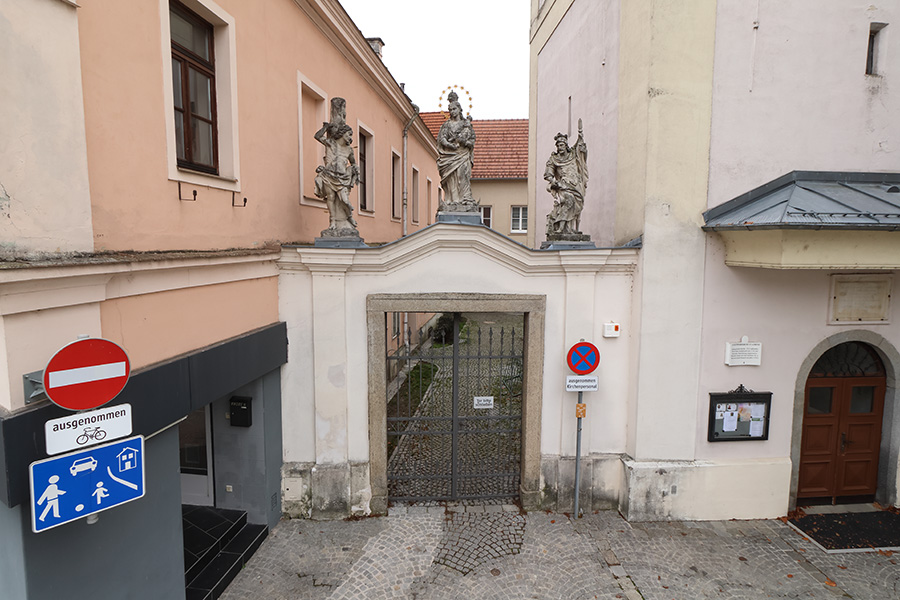 In Ybbs an der Donau ist die spätgotische Pfarrkirche gemeinsam mit dem Haus Kirchengasse Nr. 2 durch eine barocke Portalmauer miteinander verbunden. Oben auf der Mauer befinden sich mehrere Statuen, darunter jene des Heiligen Florian, des Schutzpatrons gegen Feuer und andere Gefahren. Seine Darstellung erinnert an die lange religiöse Tradition von Ybbs an der Donau und an die Bedeutung des Heiligen als Fürsprecher für die Gemeinschaft.